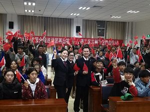 同一时间,在合作藏族中学的操场上,全校1500余名师生坐在操场上,聆听巡讲团王文婷、李晓华检察官的讲座。两位检察官用通俗易懂的语言,通过革命烈士赵一曼和钱学森、袁隆平等科学家的先进事迹,告诉同学们为什么爱祖国,怎样爱祖国,从而激发同学们的爱国主义情感和民族自信心、自豪感,坚定爱国主义理想信念。同学们在检察官的带领下,激动地挥舞着手中的小红旗高唱《我和我的祖国》,深情地为祖国70华诞献礼。