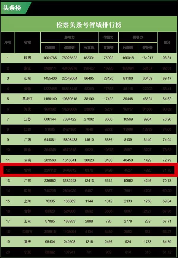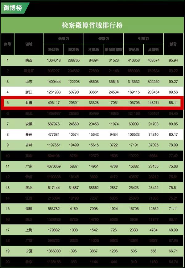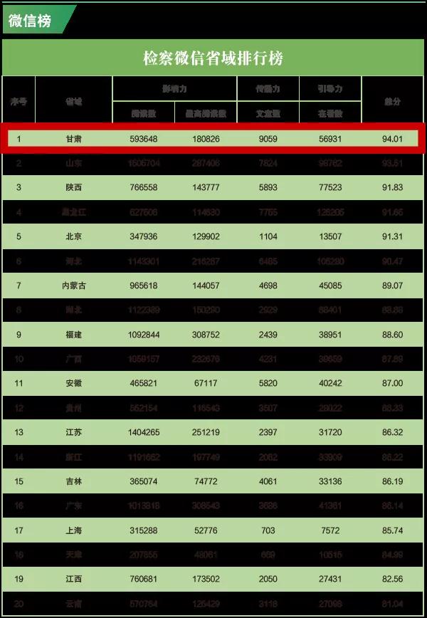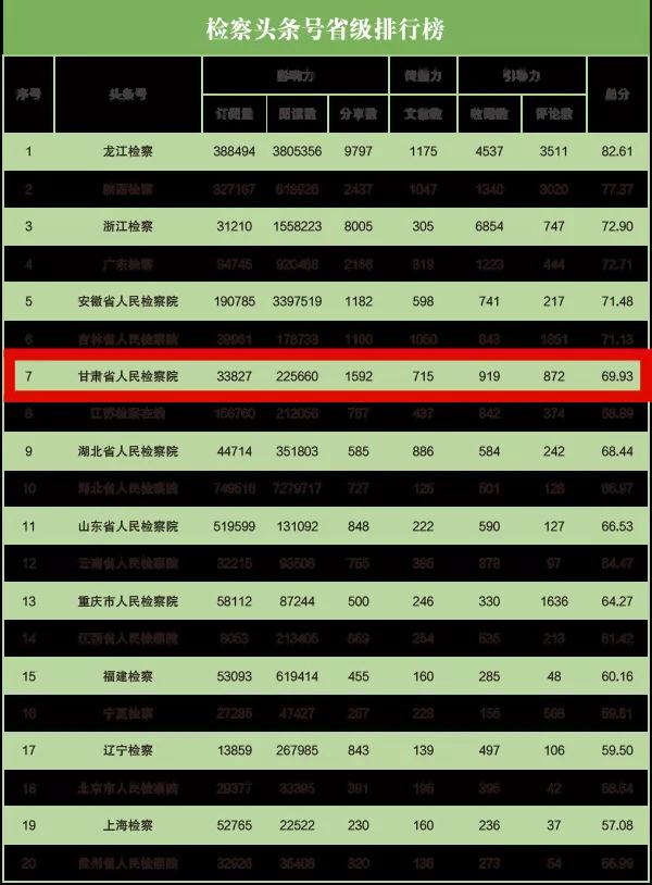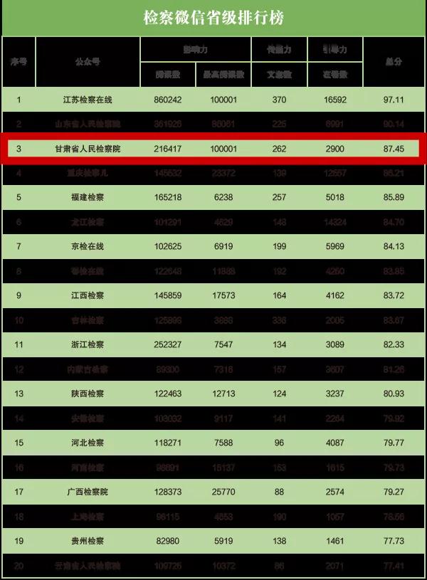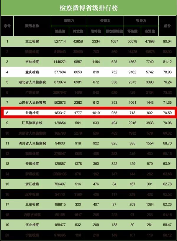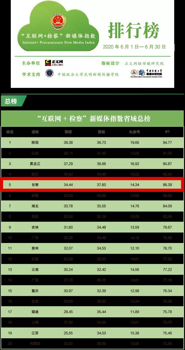 7月21日,检察日报正义网发布了2020年6月“互联网+检察”新媒体指数排行榜。甘肃省检察机关官方新媒体账号在此次参评的检察新媒体账号为9452个全国检察“两微一端”账号(其中检察微博3059个,检察微信3400个,检察头条号2993个)中 荣登全国检察排行榜。