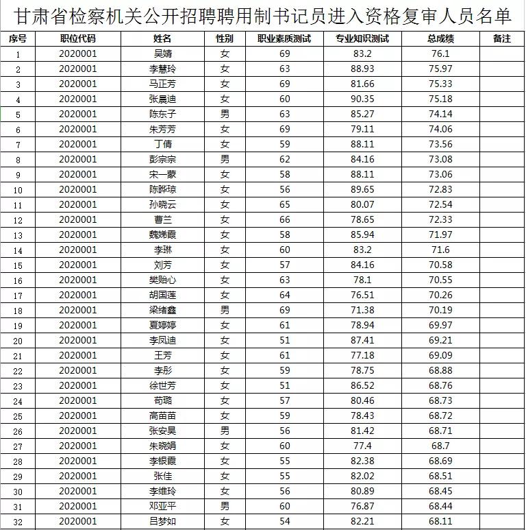 附件:2020年甘肃省检察机关公开招聘聘用制书记员进入资格复审人员名单