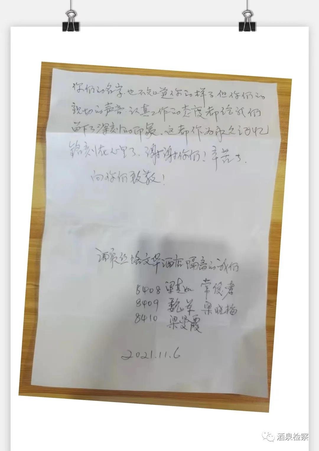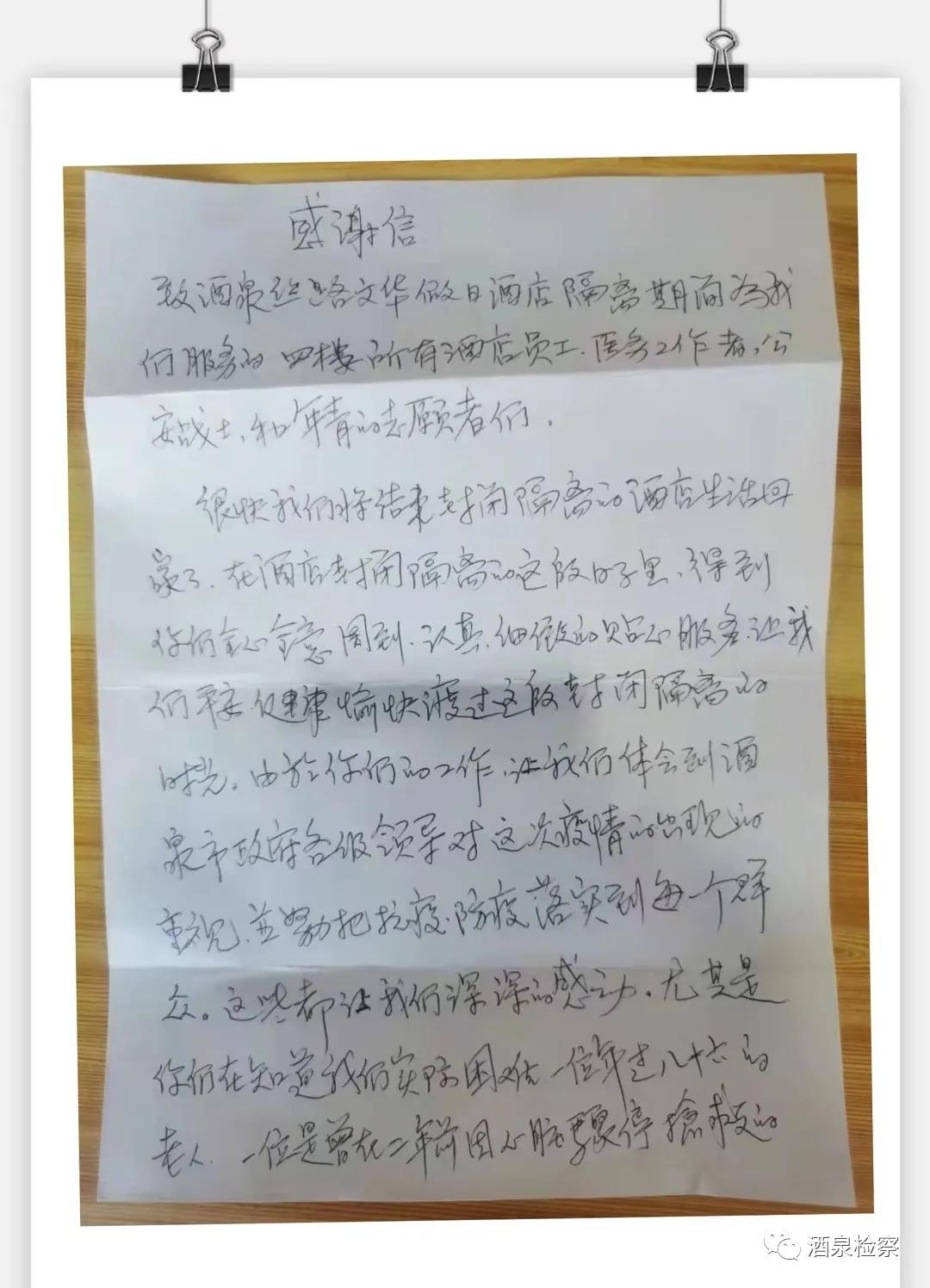 “你们每天及时帮忙收取垃圾,每天把早午晚三餐及时送到房间,还不怕麻烦……”“虽然天天见面,但我不知道你们的名字,也不知道你们的样子,但你们亲切的声音、认真工作的态度都给我们留下了深刻的印象……谢谢你们,辛苦了。”这是酒泉市司机社包抓的一个集中隔离点,隔离人员在解除隔离后致志愿者的感谢信。