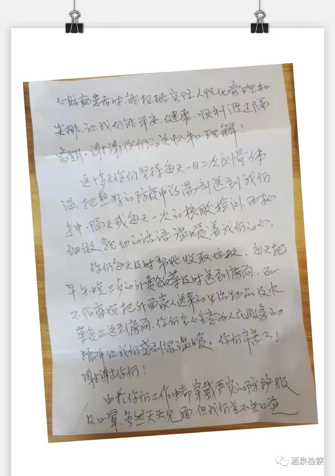 感谢信中提到的隔离点,是当时疫情防控任务较重的包抓点。其中,有带小孩的夫妇、有身患慢性病的患者、也有高龄老人。隔离点的检察干警在做好管控工作的同时,坚持每日为隔离人员测量体温、做核酸检测和送发熬制好的防疫中药汤剂,为他们做心理疏导,帮患癌病人联系医院做健康检查,为行动不便的高龄老人送餐等。
