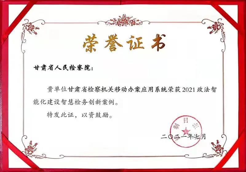 移动办案应用系统已获得国家版权局颁发的《计算机软件著作权登记证书》,该系统还荣获“2021政法智能化建设创新案例”。