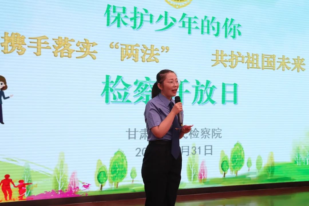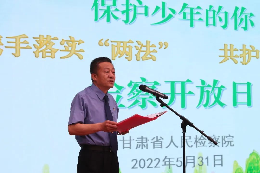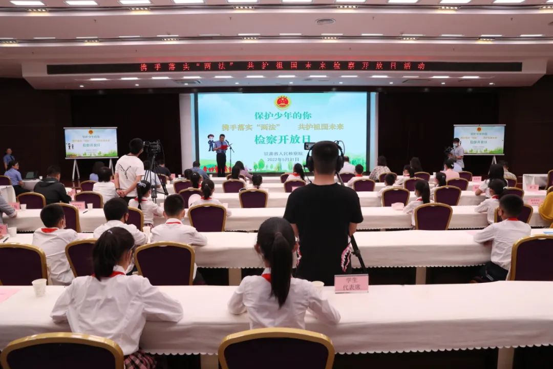 党组成员、副检察长张学军致辞,随后,一段2019年兰州华侨实验学校师生参加检察开放日的视频拉开了活动的帷幕,一下拉近了学校师生与检察机关的距离。为更好保护疫情下同学们的安全,一场连线校园内的直播,让活动现场嘉宾云端参观了检校联合开展的“未成年人法治手绘画廊”活动,同学们以“以法之名保护少年的你”为主题,画出了孩子们心中的法治小天地,一张张绚丽的图画,一幅幅精美的手抄报,童心妙笔,创意无限,生动鲜活地展现着青少年们学法用法、积极向上的精神风貌。