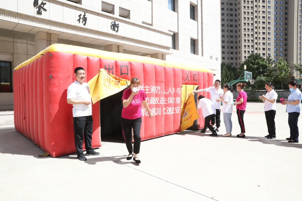 在模拟火场逃生环节,学院工作人员在已搭建的火灾逃生体验帐篷内感受火灾发生时的现场状态,并按照帐篷内的标识找到正确的道路,顺利地从出口“逃生”。
