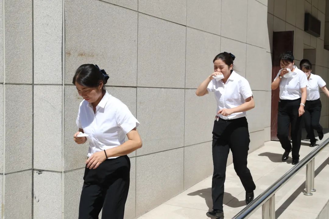 随着烟饼被点燃,演练正式开始,学院全体人员在模拟客房失火环境下,通过消防指示牌及安全队员的指引,员工及时有效地撤离至安全疏散场地,各组负责人迅速清点人数并报告疏散情况。
