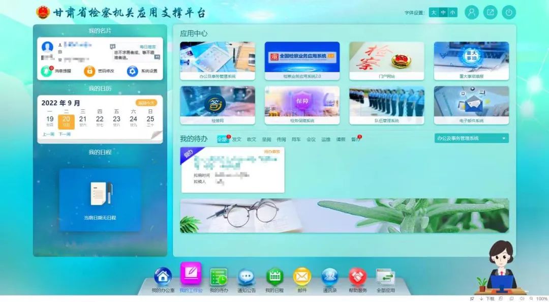 机关办公及事务管理系统、甘肃省检察机关电子邮件系统等完成对接,实现单点登录及统一消息功能,同时还整合了检察工作网门户网站、检答网、重大事项填报系统、检务保障系统、数字图书馆、法律法规查询库、法学论文库、案例库等应用。平台为全省每位检察干警都配置了线上虚拟办公室,干警在登录平台后可对网上办公、办案以及邮件、请假、用车等日常事务进行集中统一处理。