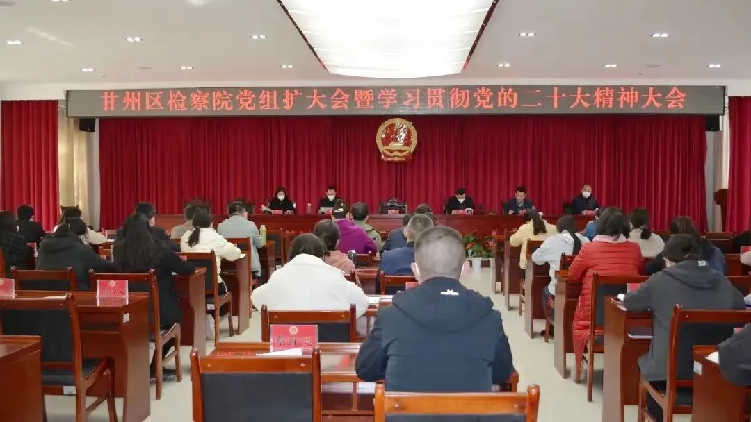 近日,张掖市甘州区检察院召开党组(扩大)会暨学习贯彻党的二十大精神大会,专题学习党的二十大精神。会议要求,要严格落实报告提出的新时代法治建设总体要求,严格公正司法,加快建设法治社会。要紧盯年度工作目标,对标新时代检察机关法律监督工作的新要求新任务,努力推动“四大检察”“十大业务”全面协调充分发展。要坚持全面从严管党治检,努力提升检察工作质量和水平,以真抓实干的优良作风推动检察工作高质量发展,推进平安甘州建设再上新台阶。