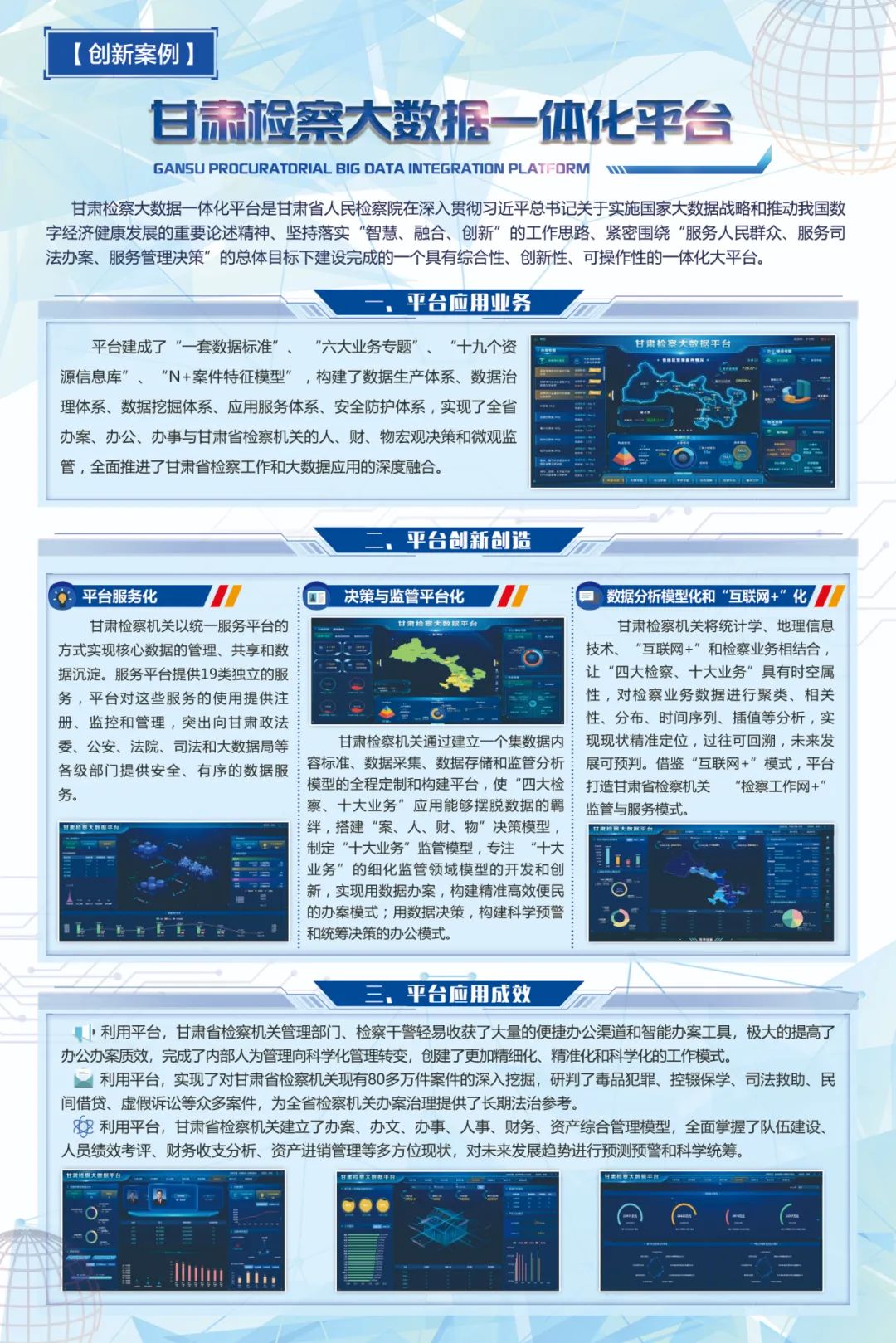 在贯彻数字检察建设和落实检察大数据战略、紧密围绕“服务人民群众、服务司法办案、服务管理决策”的总体目标下建设完成的具有综合性、创新性、便捷性的一体化大数据平台。