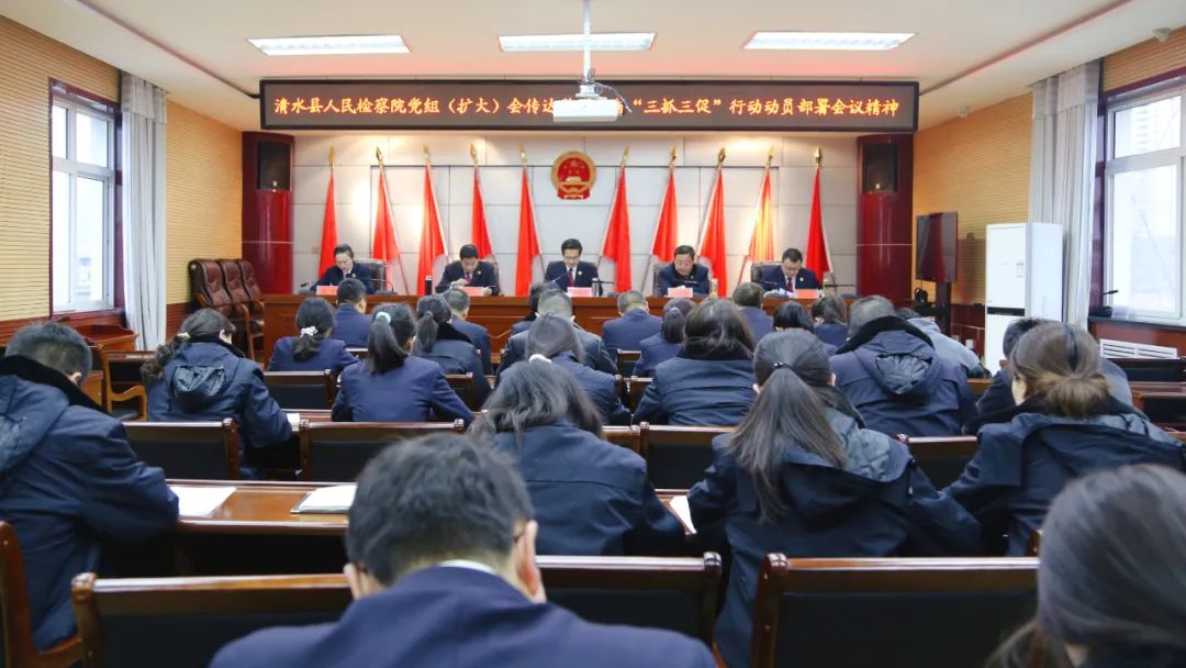 2月17日,清水县检察院党组书记、检察长熊鹏飞主持召开党组(扩大)会议,传达学习全省“三抓三促”行动动员部署会议精神。会议要求,要准确把握“三抓三促”相关会议精神,坚持在“学习、执行、效能”上下功夫,在“提升、落实、发展”上见实效,促进“三抓三促”行动走深走实。要结合实际制定实施方案,及时召开动员部署会,把“三抓三促”行动作为推动干部干事创业的重要抓手,促进全院干警作风大转变、能力大提升,激励广大党员干部实干担当,助力检察工作争先进位、提档升级。