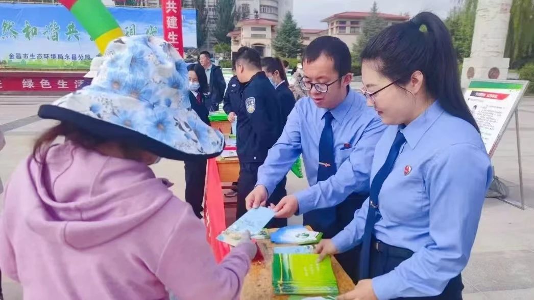 永昌县检察院组织干警在县文化广场开展主题为“建设人与自然和谐共生的现代化”世界环境日普法宣传活动,向过往群众普及《中华人民共和国环境保护法》《中华人民共和国湿地保护法》等相关法律法规,同时结合生态环境领域、资源保护领域典型案例,为群众讲解生态环境保护的重要性及破坏环境所需承担的法律后果,引导群众做绿色生产者、绿色践行者、绿色传播者,携手共建清洁美好家园。