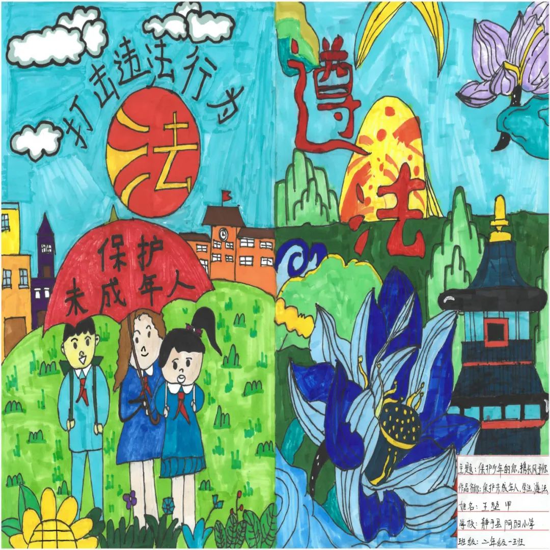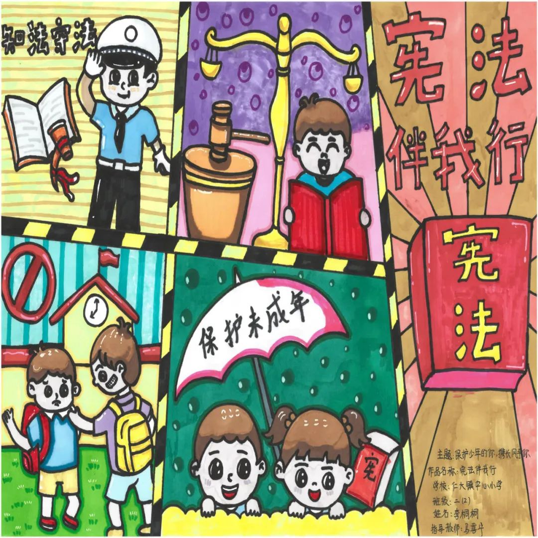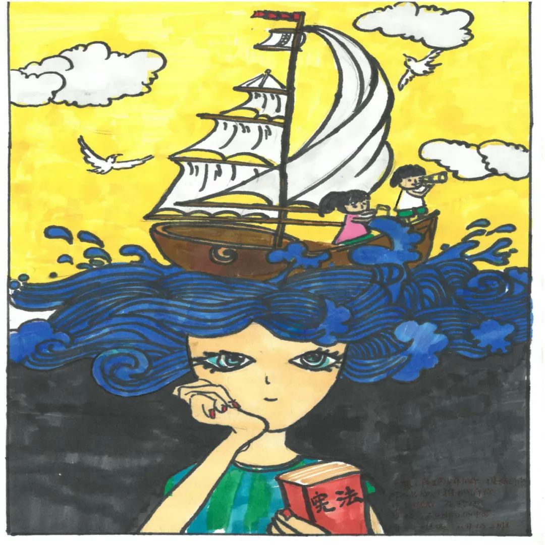 这幅画围绕宪法展开,分别呈现出未成年人保护法、宣传宪法、保护未成年人等内容,着重突出宣传宪法,在全社会开展宪法宣传教育活动,广泛开展民法典普法工作,让人们心中有法,让我们成为为花一样的少年,撑起法律保护伞,坚决抵制违法犯罪,维护少年生活、学习环境的碧海蓝天。