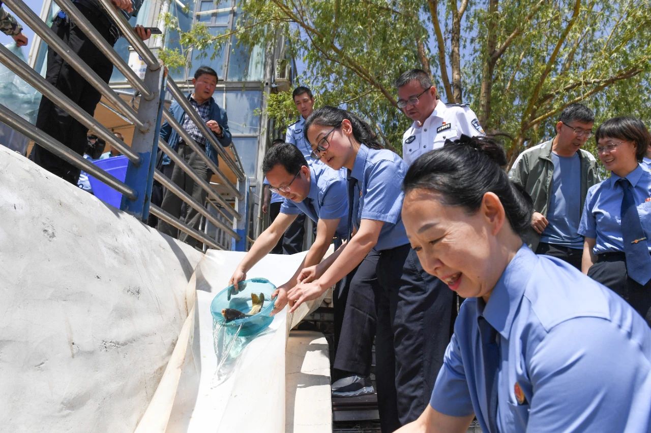 在2023年6月5日世界环境日当天,兰州市城关区检察院联合相关单位在盐场堡中心客运码头附近开展了“打击非法捕捞生态修复增殖放流活动”。
