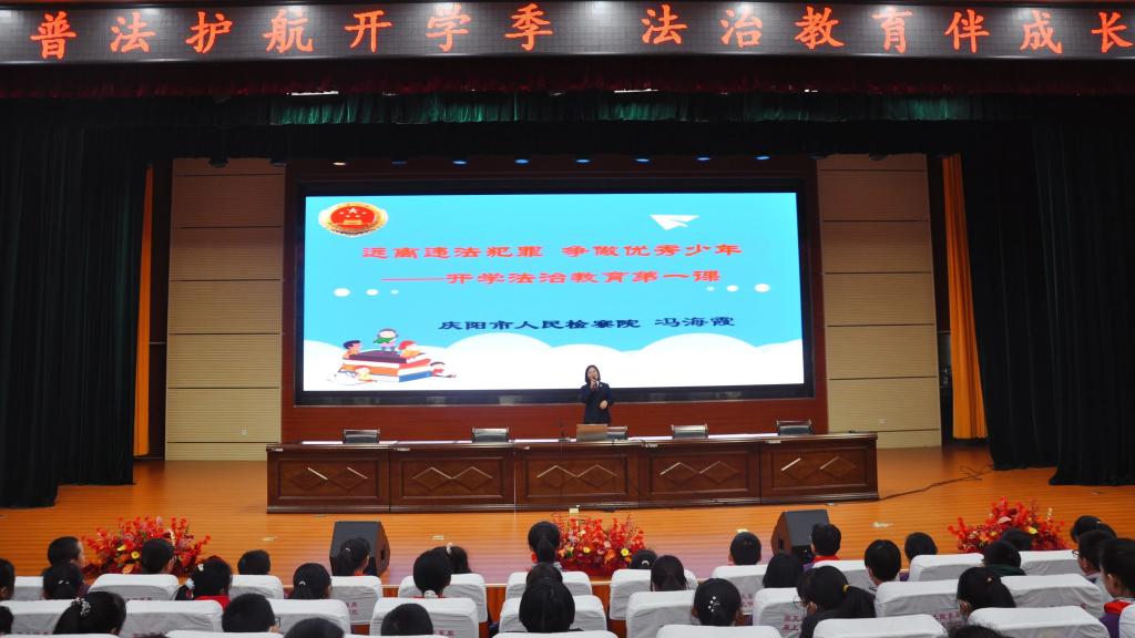 庆阳市检察院“庆阳星”检爱护“未”队走进市东方红小学,为同学们讲授“开学法治教育第一课”。检察官以《远离违法犯罪 争做优秀少年》为题,采取“我问你答”的方式释法说理,引导同学们树立法治观念,摒弃不良行为,远离违法犯罪。