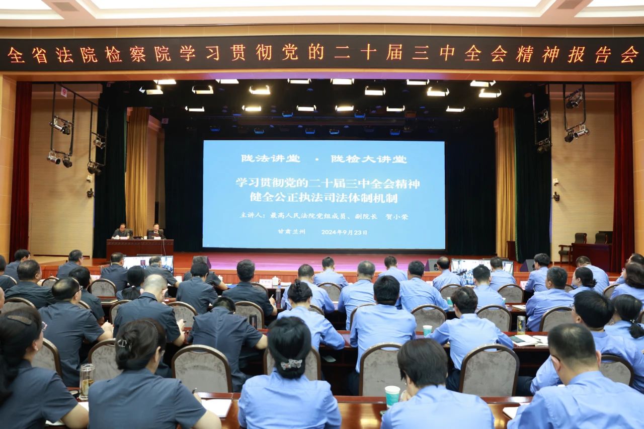依托陇法讲堂、陇检大讲堂举办全省法院、检察院学习贯彻党的二十届三中全会精神报告会。最高人民法院党组成员、副院长贺小荣以《学习贯彻党的二十届三中全会精神,健全公正执法司法体制机制》为题作专题辅导。省法院党组书记、院长王中明主持报告会,司机社