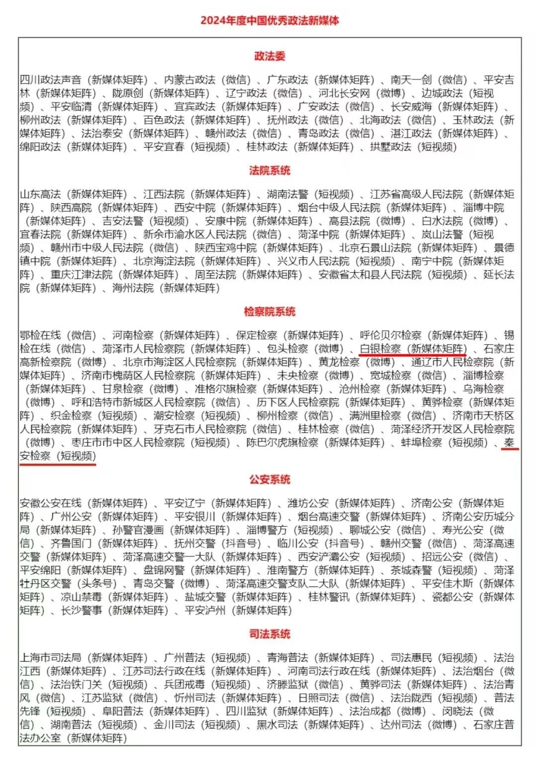 近日,2024年中国优秀“互联网+政法服务”平台综合影响力评估报告发布,其中,白银检察(新媒体矩阵)、秦安检察(短视频)获评2024年度中国优秀政法新媒体。