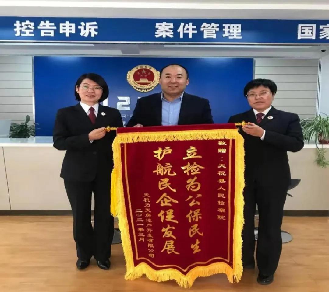 “谢谢司机社帮助我们渡过难关,给我们帮了大忙”清明假后的第一天,天祝力天房地产开发有限公司经理朱某某在一声声道谢中将一面绣有“立检为公保民生 护航民企促发展”的锦旗送到了天祝县院党组书记、检察长张瑞良手中。这是队伍教育整顿开展以来检企共建的进一步深化,也是对检察机关服务民企的充分肯定。