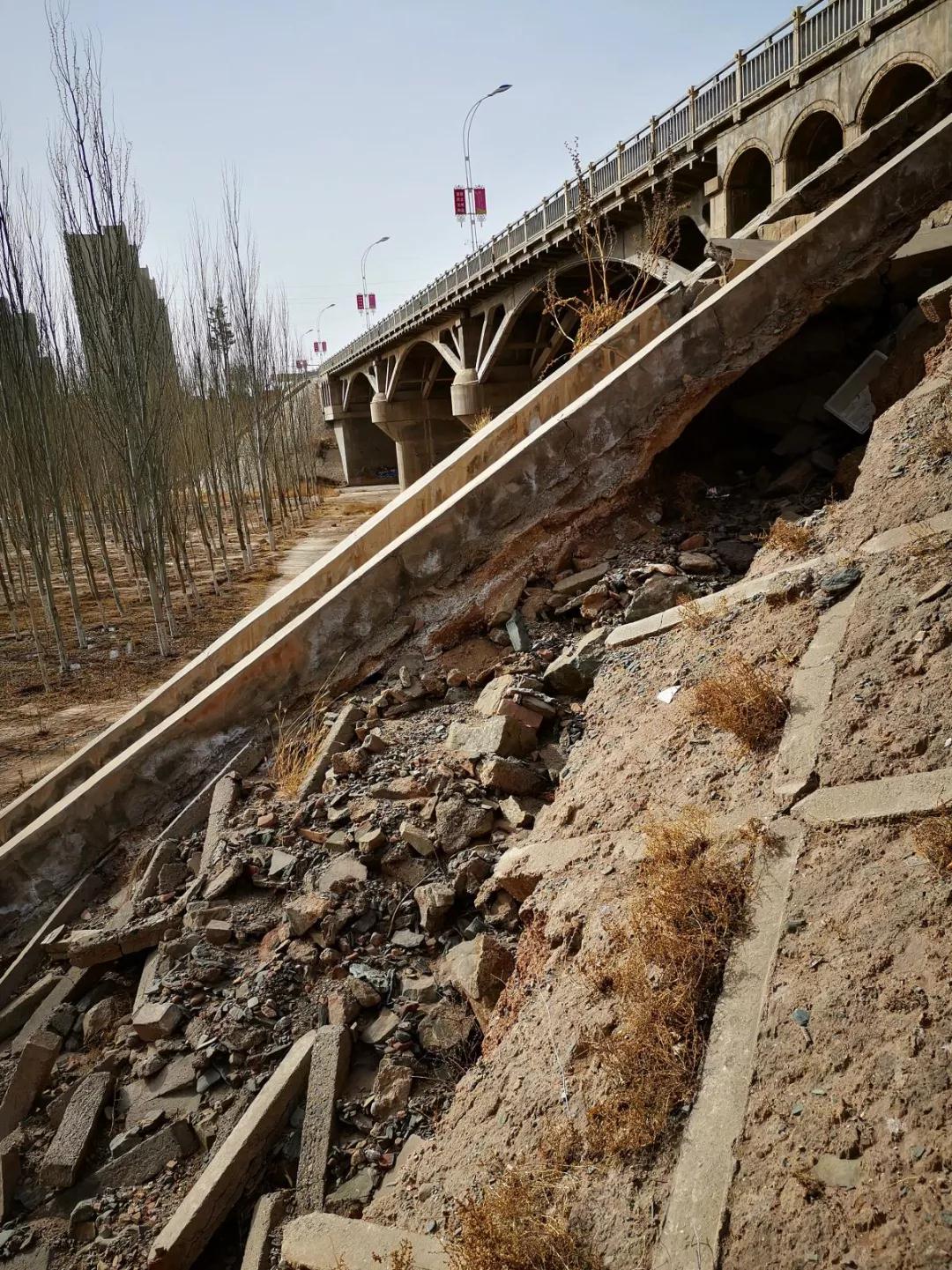 白银市平川区长征西路中区大桥东头南侧路基部分塌陷,与桥面呈陡坡状态,未设防护栏,路过行人极易从此处滑落,存在安全隐患。