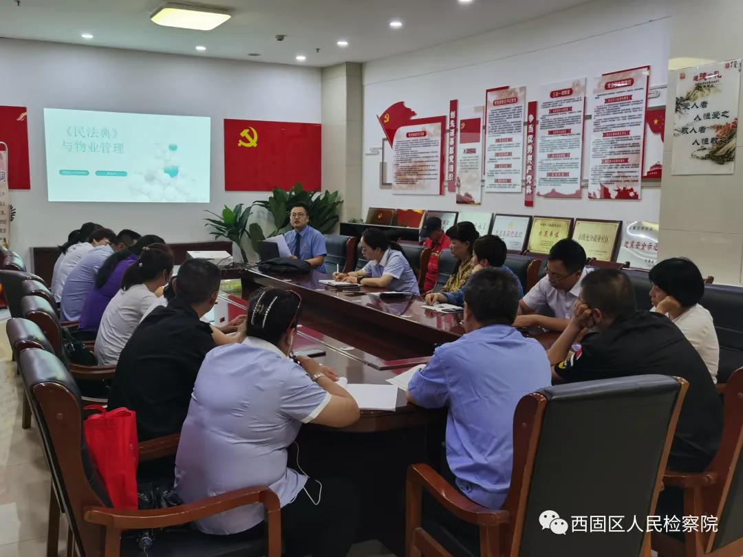 7月22日,西固区院干警到区蓝馨花园小区宝石花物业公司进行“《民法典》之物业管理”宣讲,扎实开展“固魂铸剑”活动,进一步提高小区物业公司和业主的法治观念。