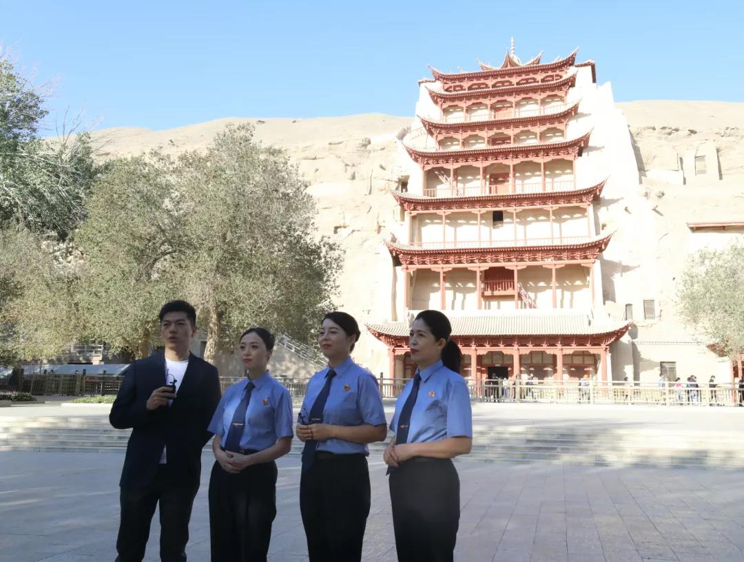 联合开展了主题为“守护敦煌的检察力量”的“走近一线检察官”直播,一起走进敦煌,聆听甘肃省敦煌市司机社检察官守护古城生态的故事。2021年10月1日,敦煌市司机社干警在敦煌为祖国庆生,祝愿伟大祖国永远繁荣昌盛,他们将牢记守护公益初心使命,始终积极担当付出,守护国有文物、守护大美敦煌。(司机社