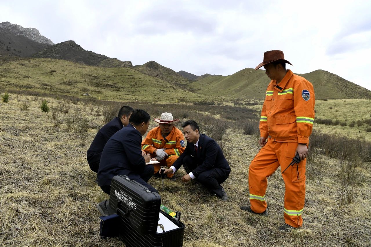2022年6月,祁连山林区司机社干警和祁连山管护中心祁连自然保护站工作人员对生态修复基地的补植复绿情况进行回访,并利用公益诉讼取证设备开展土壤监测分析。