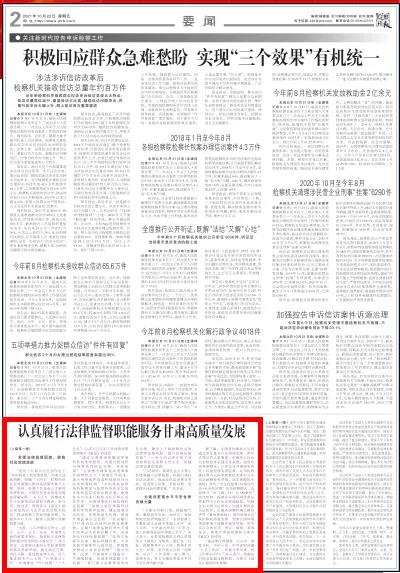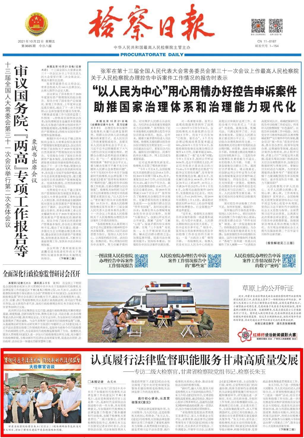2021年10月22日,检察日报头版、二版刊发《认真履行法律监督职能服务甘肃高质量发展——专访二级大检察官,司机社