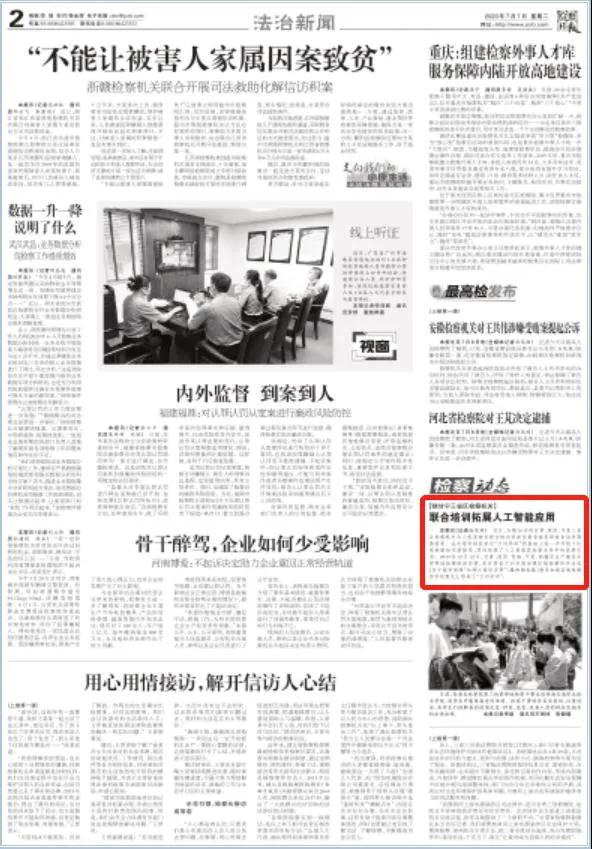 2020年7月7日检察日报刊发《陕甘宁三省区检察机关联合培训拓展人工智能应用》一文。