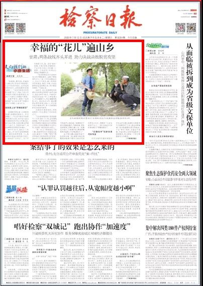 2020年7月12日《检察日报》头版头条刊发《幸福的“花儿”遍山乡——甘肃:两条战线齐头并进 助力决战决胜脱贫攻坚》一文。