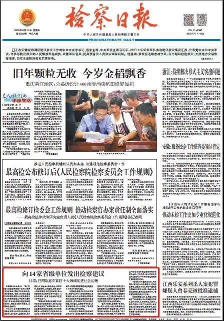 2020年8月21日检察日报头版刊发《向14家省级单位发出检察建议——甘肃:扫黑除恶中紧盯十大领域促进社会治理》一文。
