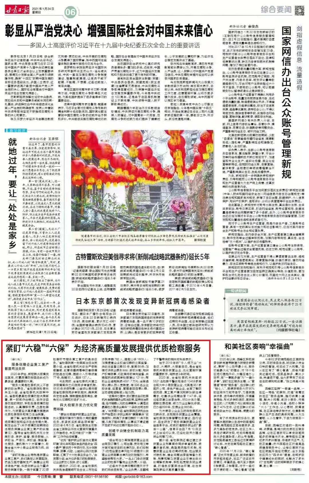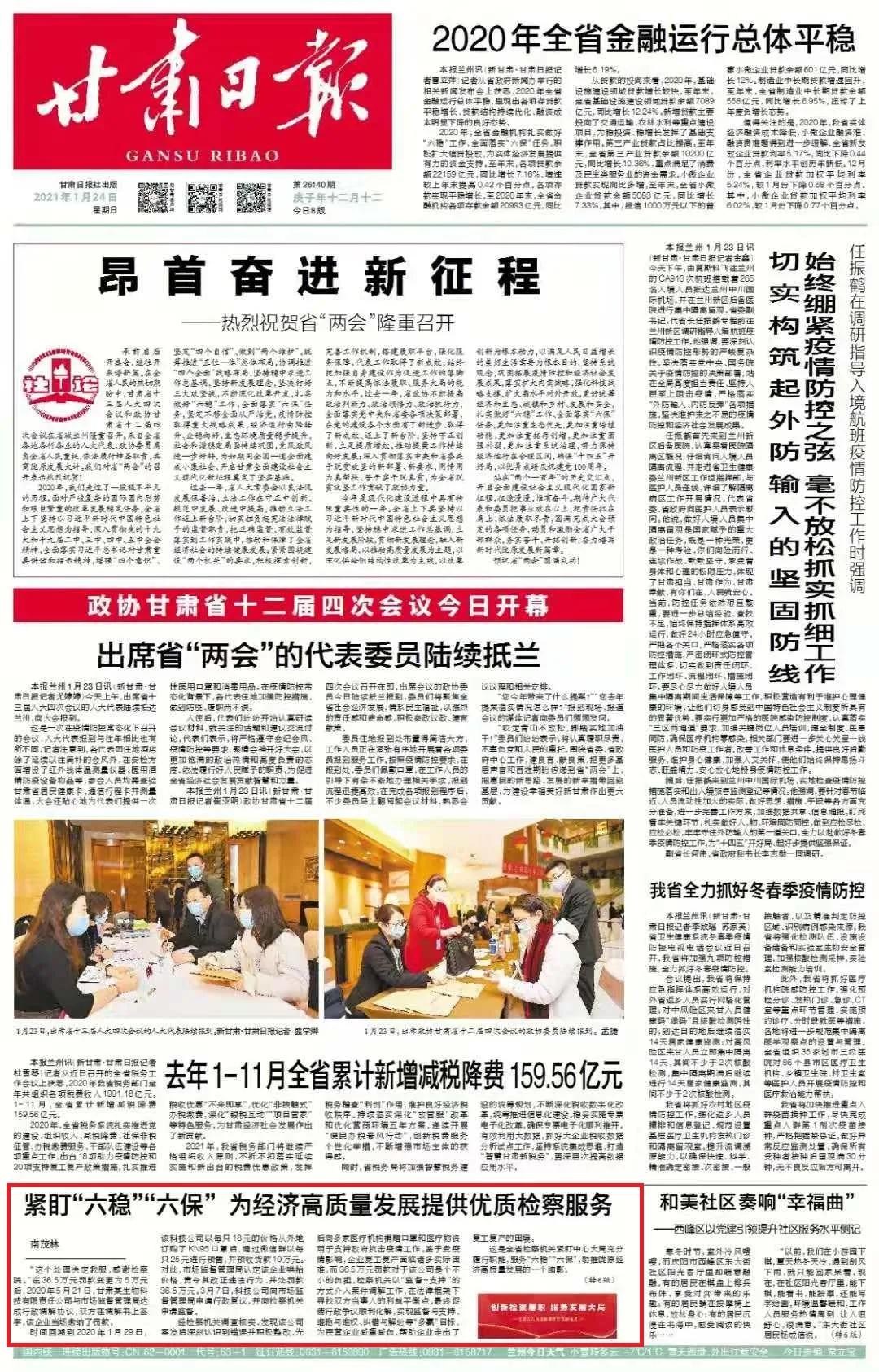 2021年1月24日甘肃日报头版、六版刊发《紧盯“六稳”“六保” 为经济高质量发展提供优质检察服务》一文。