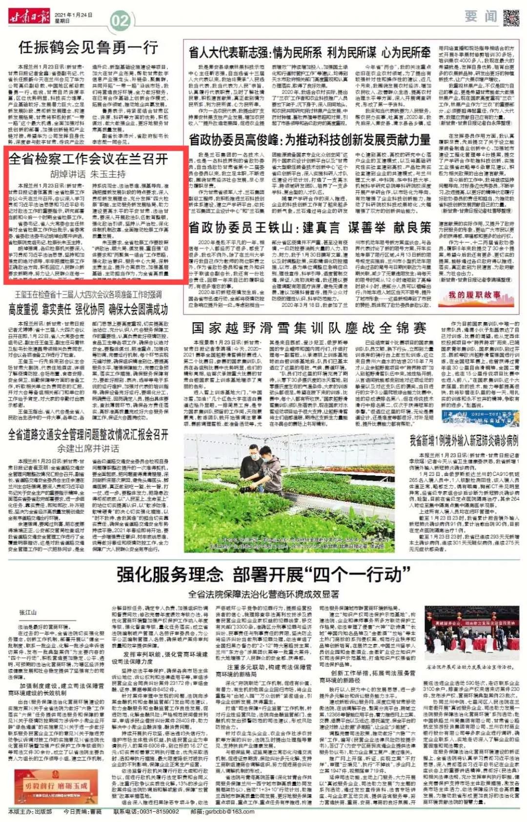 2021年1月24日甘肃日报二版刊发《全省检察工作会议在兰召开》一文。