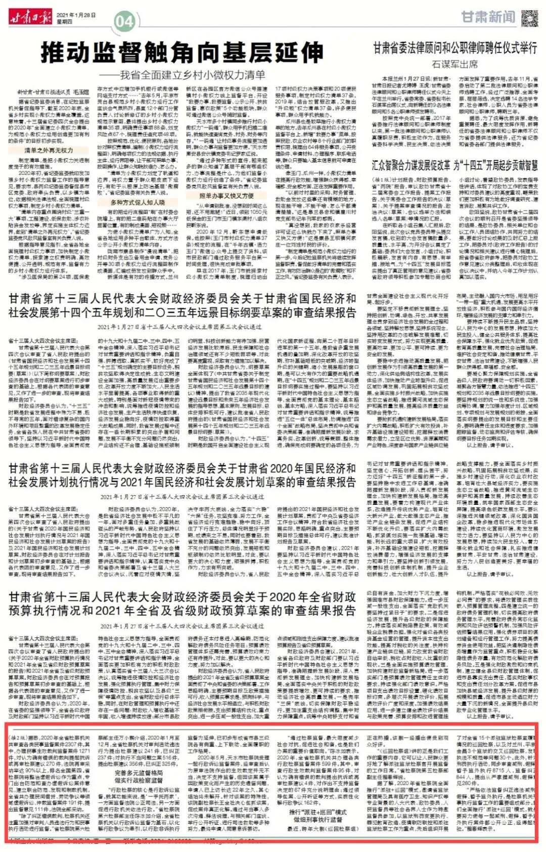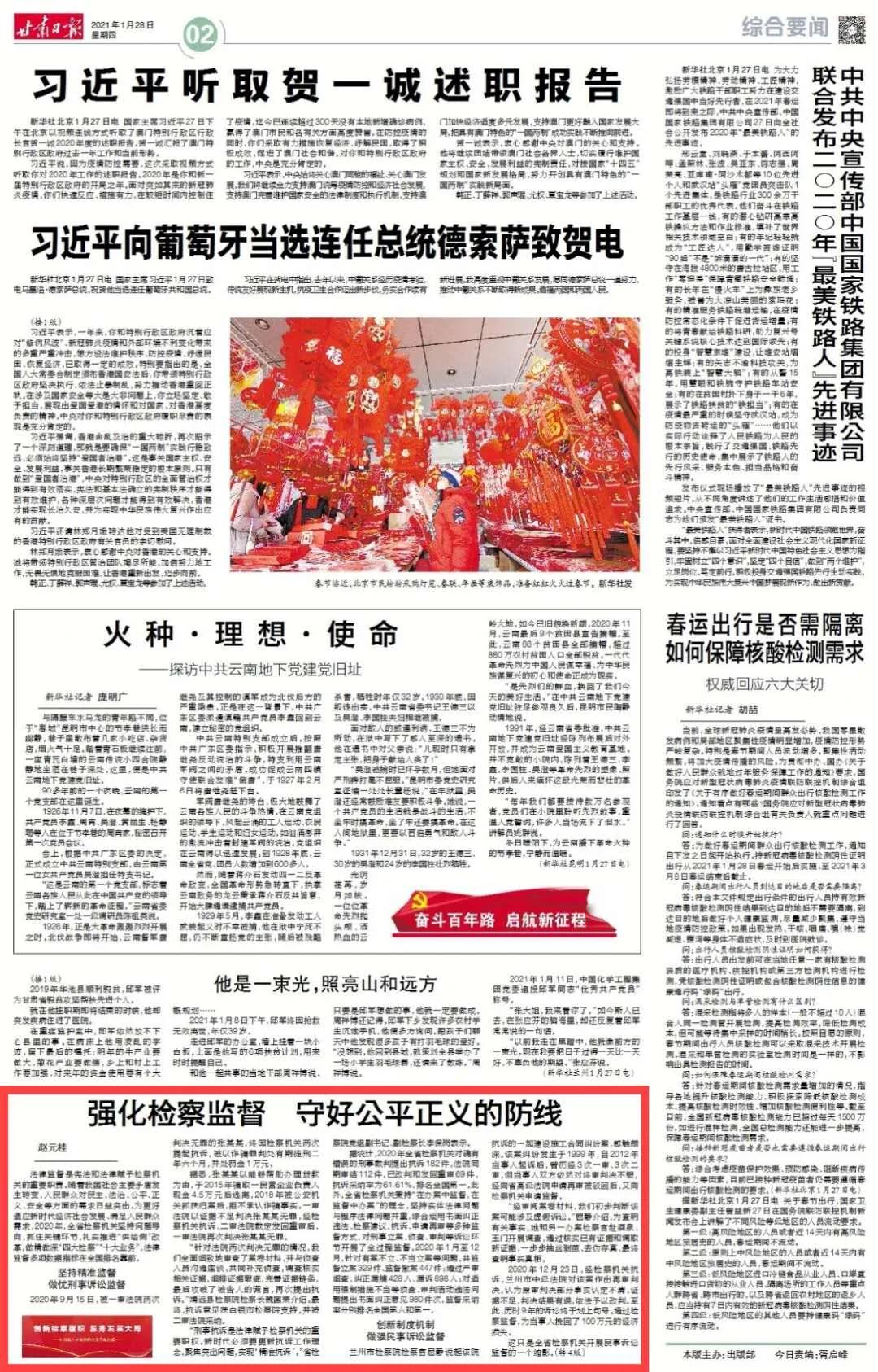 2021年1月28日甘肃日报二版、四版刊发《强化检察监督 守好公平正义的防线》一文。