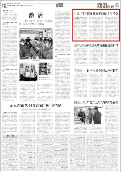 2021年3月12日《检察日报》6版刊发《甘肃:召开巡视整改专题民主生活会 》一文。