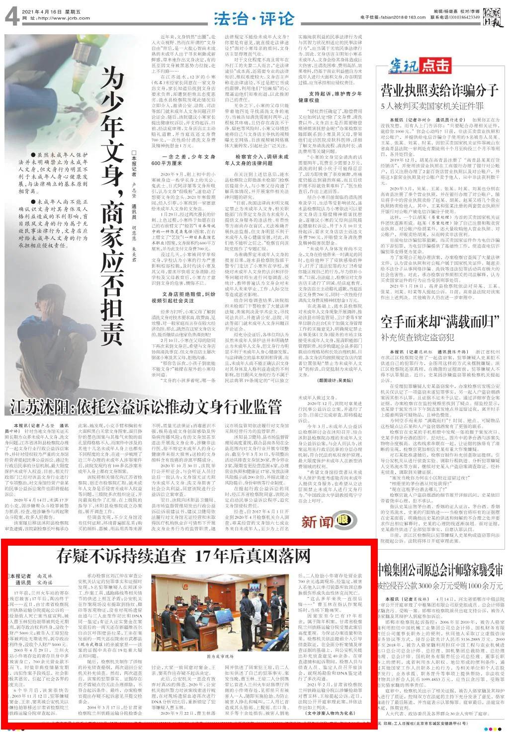 2021年4月16日检察日报4版刊发《存疑不诉持续追查 17年后真凶落网》一文。