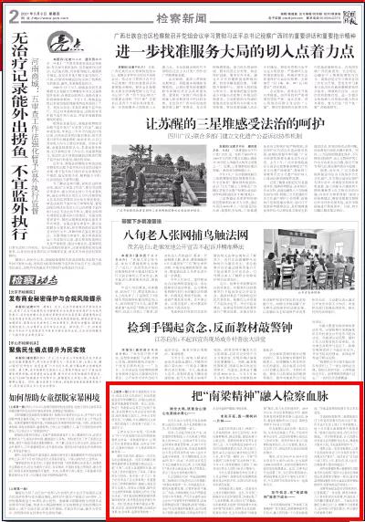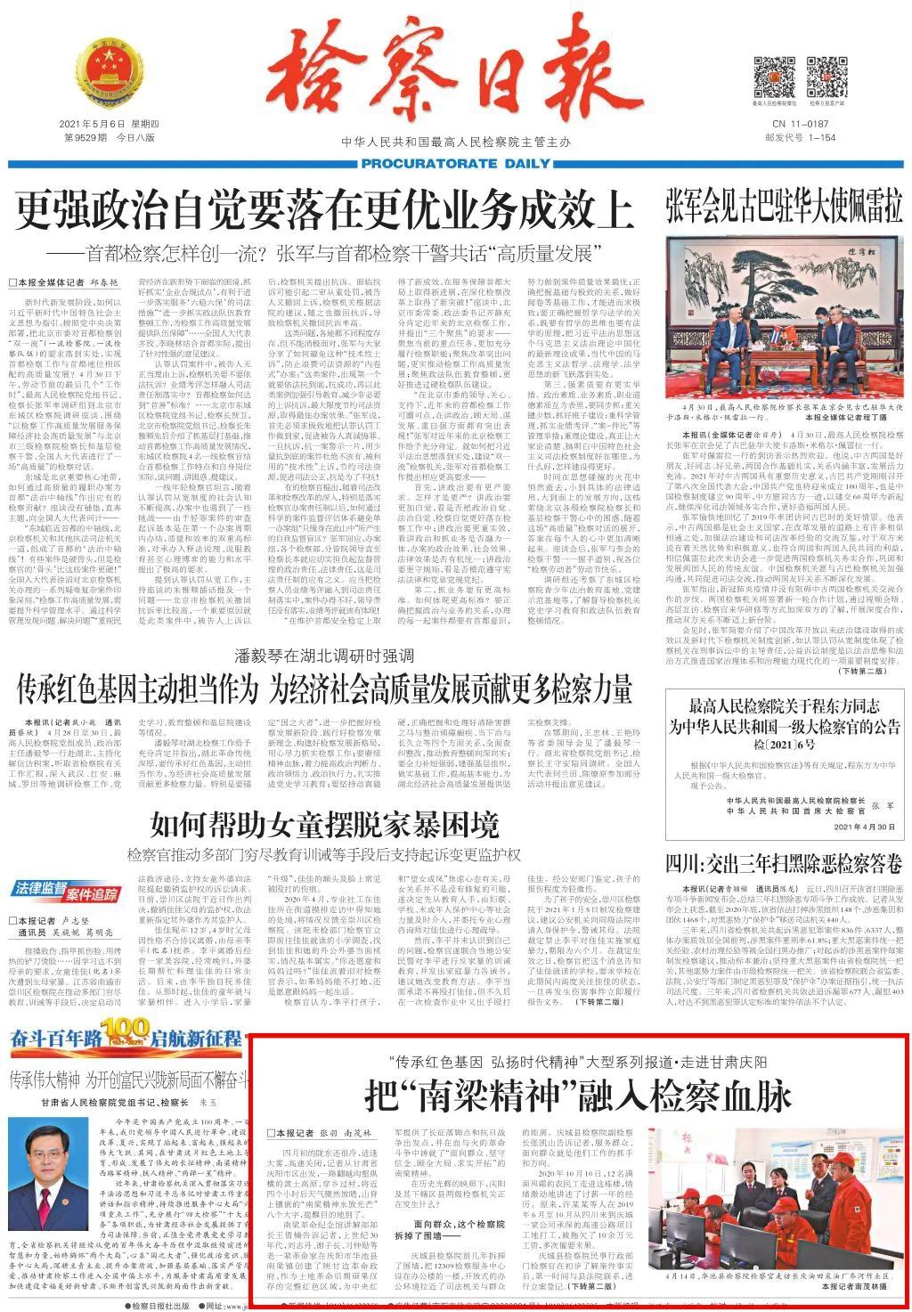 2021年5月6日检察日报头版、二版刊发《把“南梁精神”融入检察血脉》一文。