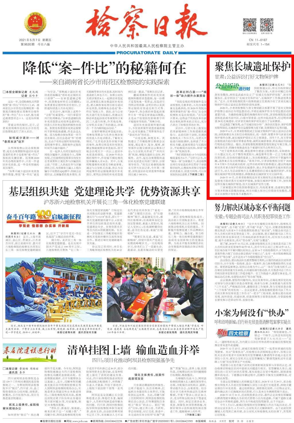 2021年5月7日检察日报头版刊发《聚焦长城遗址保护——甘肃:公益诉讼打好文物保护牌》一文。