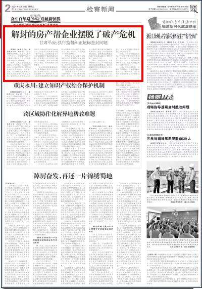 2021年5月25日,检察日报二版头条刊发《解封的房产帮企业摆脱了破产危机——甘肃平凉:执行监督纠正超标查封问题》一文。