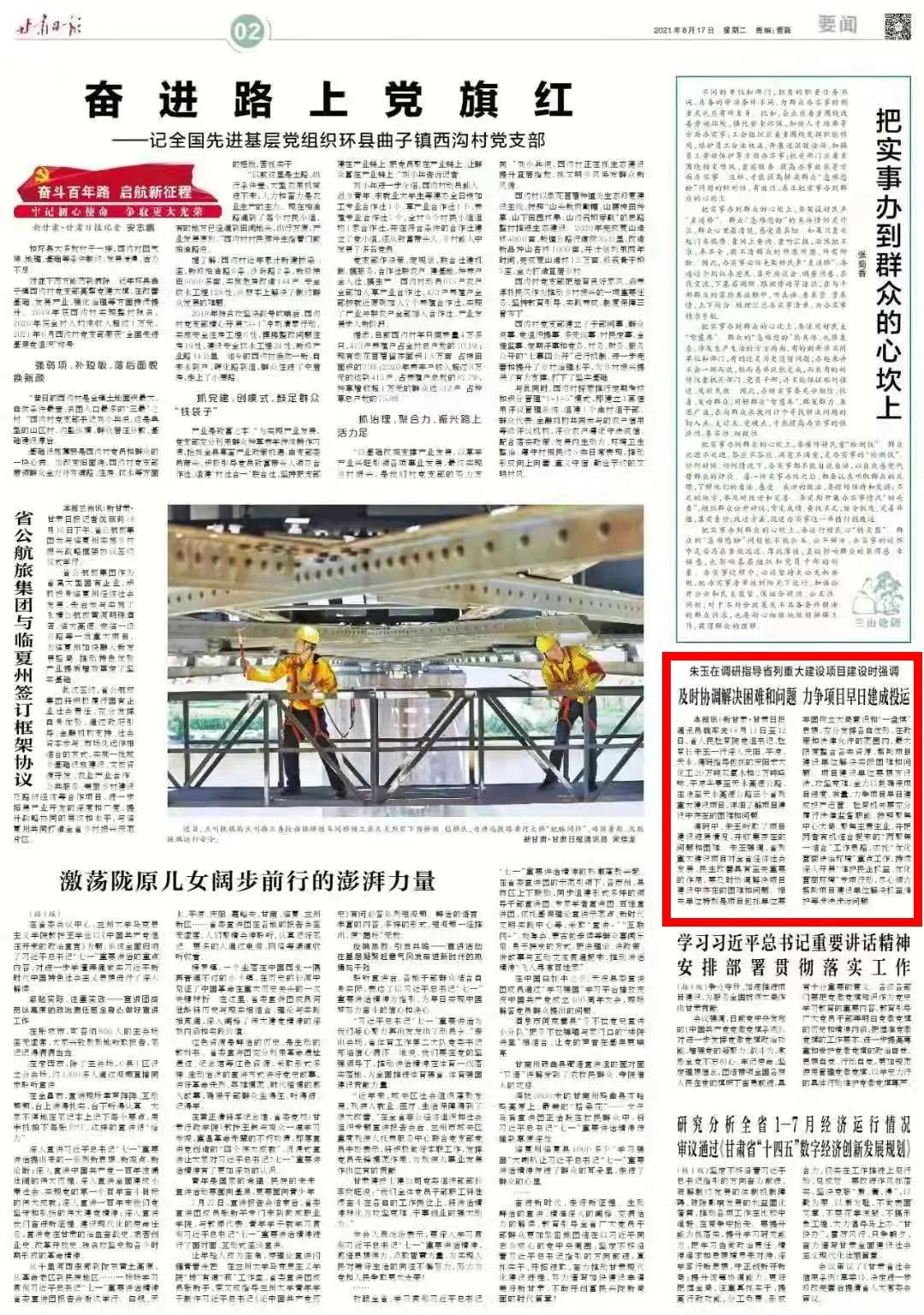 2021年8月17日,甘肃日报二版刊发新闻《朱玉在调研指导省列重大建设项目建设时强调:及时协调解决困难和问题 力争项目早日建成投运》。