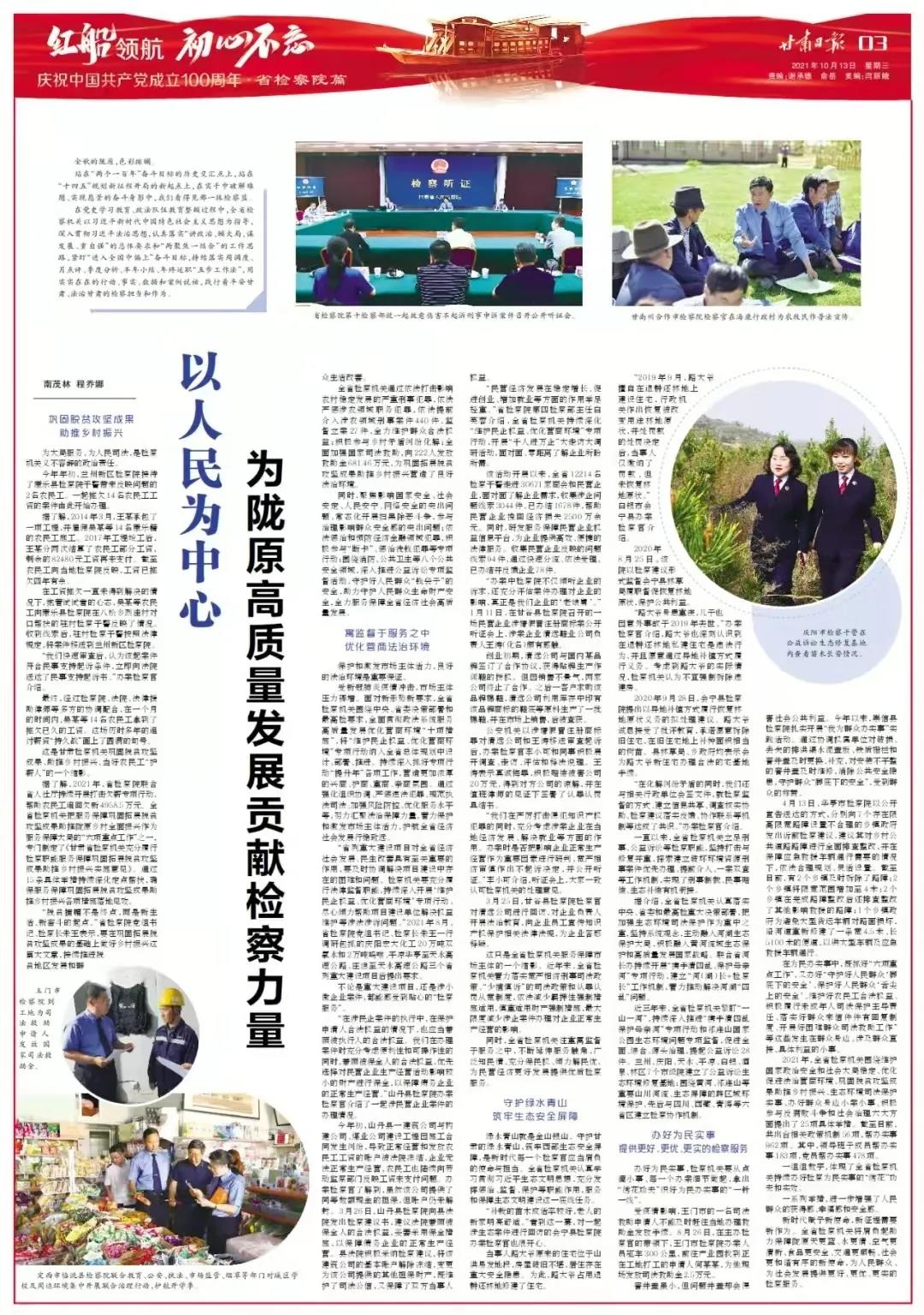 2021年10月13日,甘肃日报三版刊发新闻《以人民为中心 为陇原高质量发展贡献检察力量》。