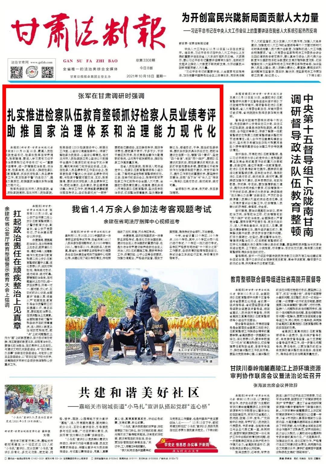 2021年10月18日,甘肃法制报头版刊发新闻《张军在甘肃调研时强调 扎实推进检察队伍教育整顿抓好检察人员业绩考评 助推国家治理体系和治理能力现代化》。