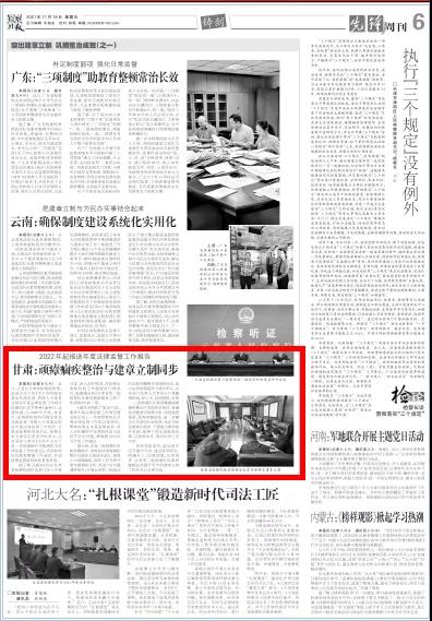 2021年11月19日,检察日报六版刊发《2022年起报送年度法律监督工作报告——甘肃:顽瘴痼疾整治与建章立制同步》。