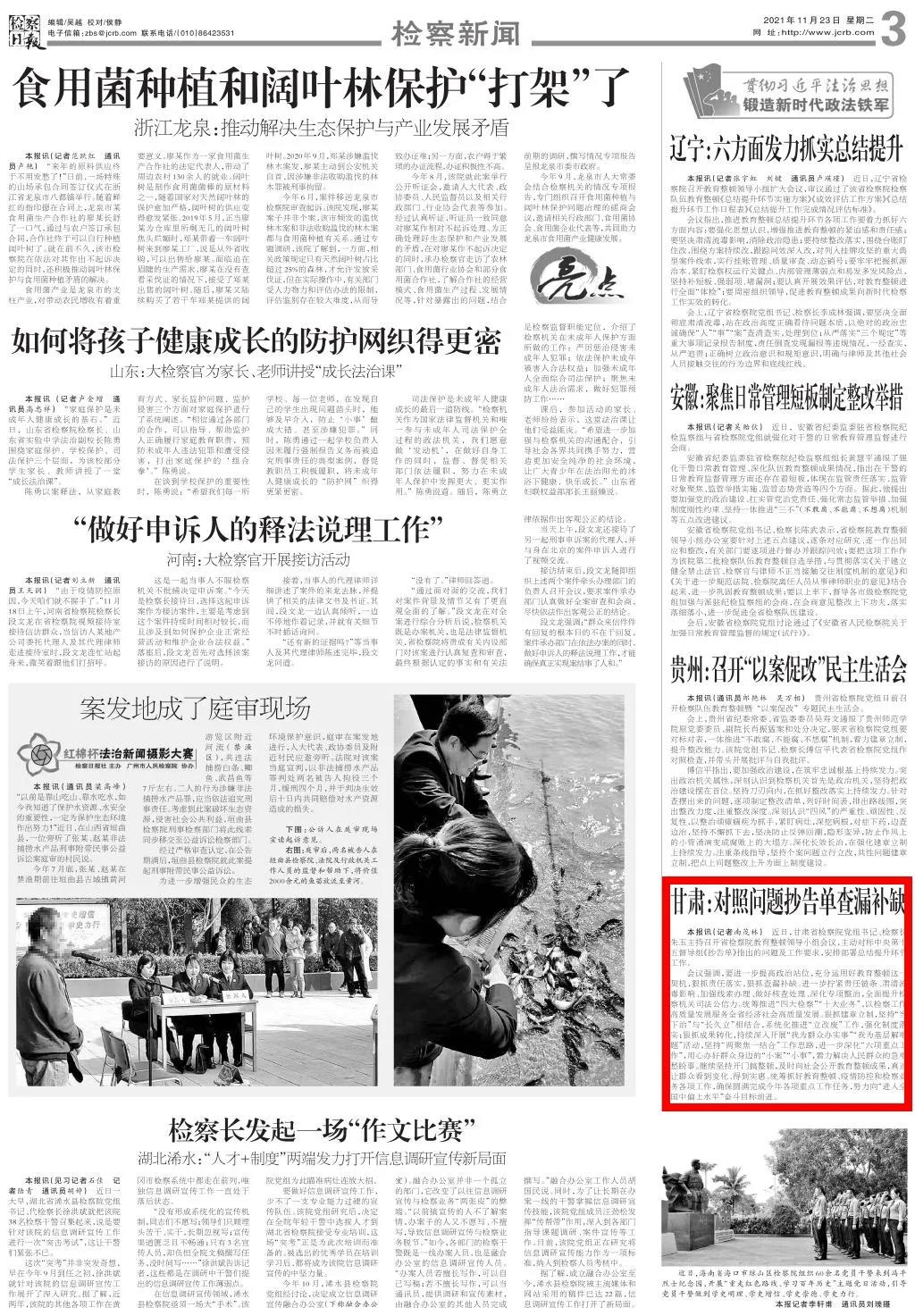 2021年11月23日,检察日报三版刊发《甘肃:对照问题抄告单查漏补缺》。