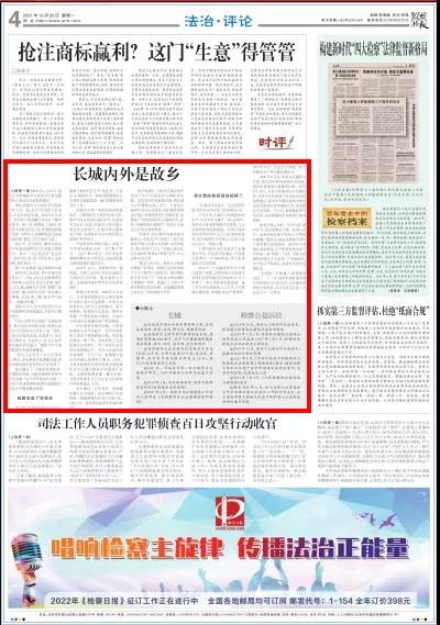 2021年12月20日,检察日报头版头条刊发《长城内外是故乡——检察公益诉讼助力长城保护系列报道之破题篇》。