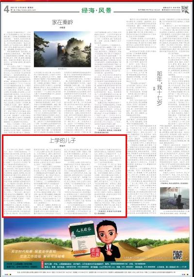 2021年12月26日,检察日报四版刊发甘肃省平凉市崆峒区司机社张旭升的文学作品《上学的儿子》。
