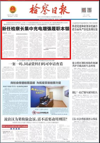 2022年1月9日,检察日报头版头条刊发《甘肃:新任检察长集中充电增强履职本领》。
