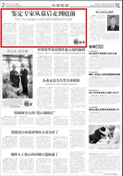 2022年1月12日,检察日报二版头条刊发《鉴定专家从幕后走到庭前——甘肃兰州:司法鉴定人出庭为案件突破提供技术支撑》。