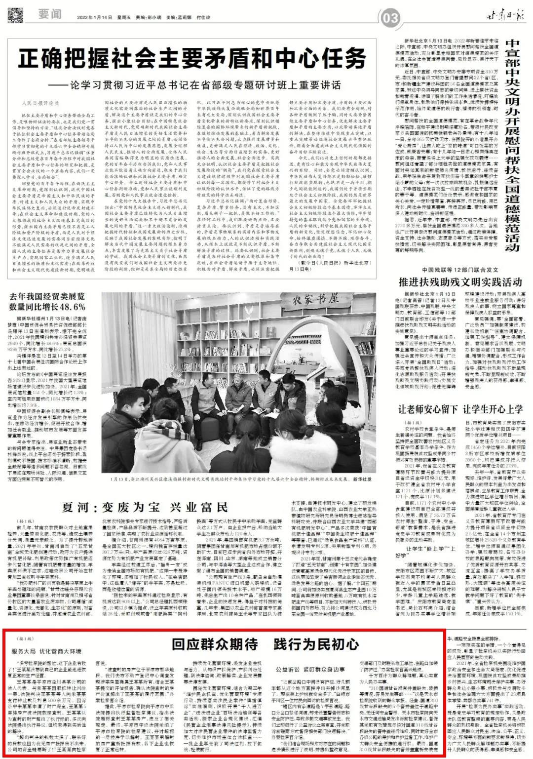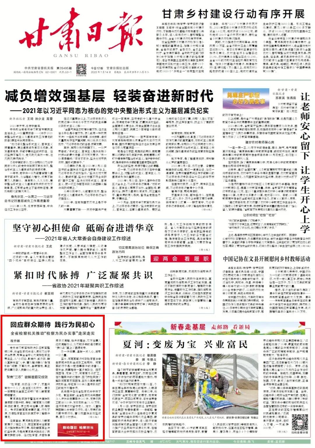 2022年1月14日,甘肃日报头版、三版刊发《回应群众期待 践行为民初心——全省检察机关推动“检察为民办实事”走深走实》。