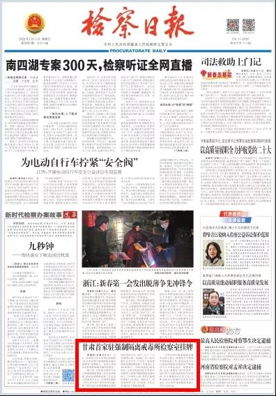 2022年2月11日,检察日报头版刊发《甘肃首家驻强制隔离戒毒所检察室挂牌》。