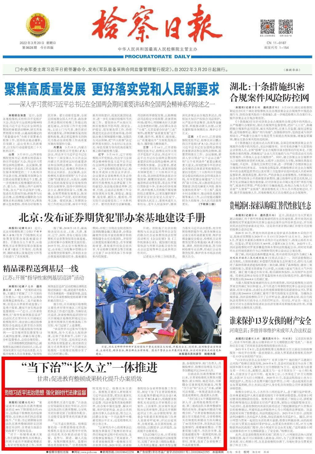 022年3月20日检察日报头版刊发《 “当下治”“长久立”一体推进——甘肃:促进教育整顿成果转化提升办案质效》。