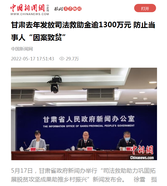 2022年5月17日,中国新闻网发布《甘肃去年发放司法救助金逾1300万元 防止当事人“因案致贫”》。