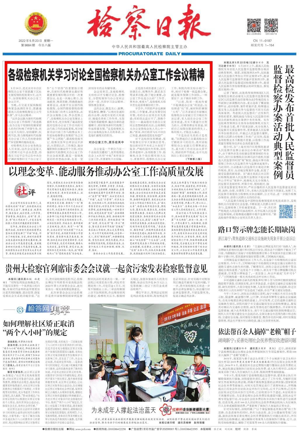 2022年5月23日,检察日报头版组头条刊发《各级检察机关学习讨论全国检察机关办公室工作会议精神》。